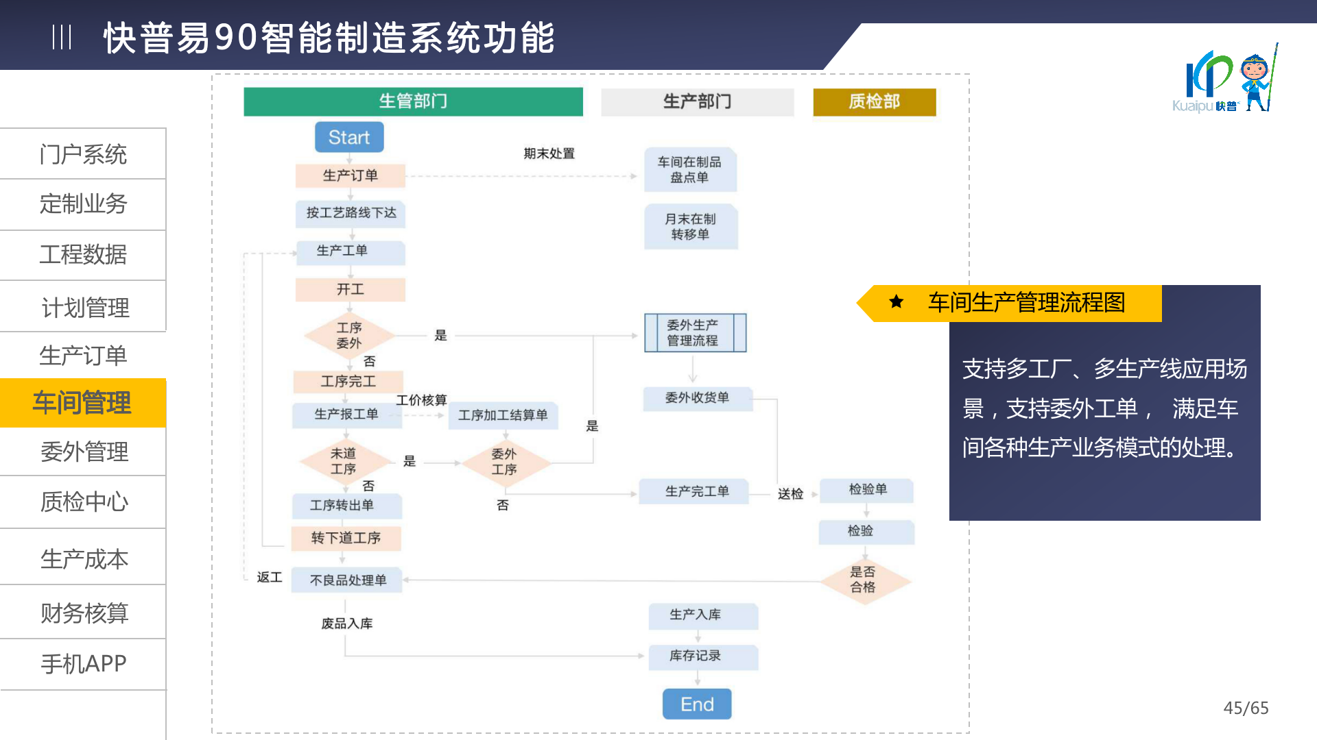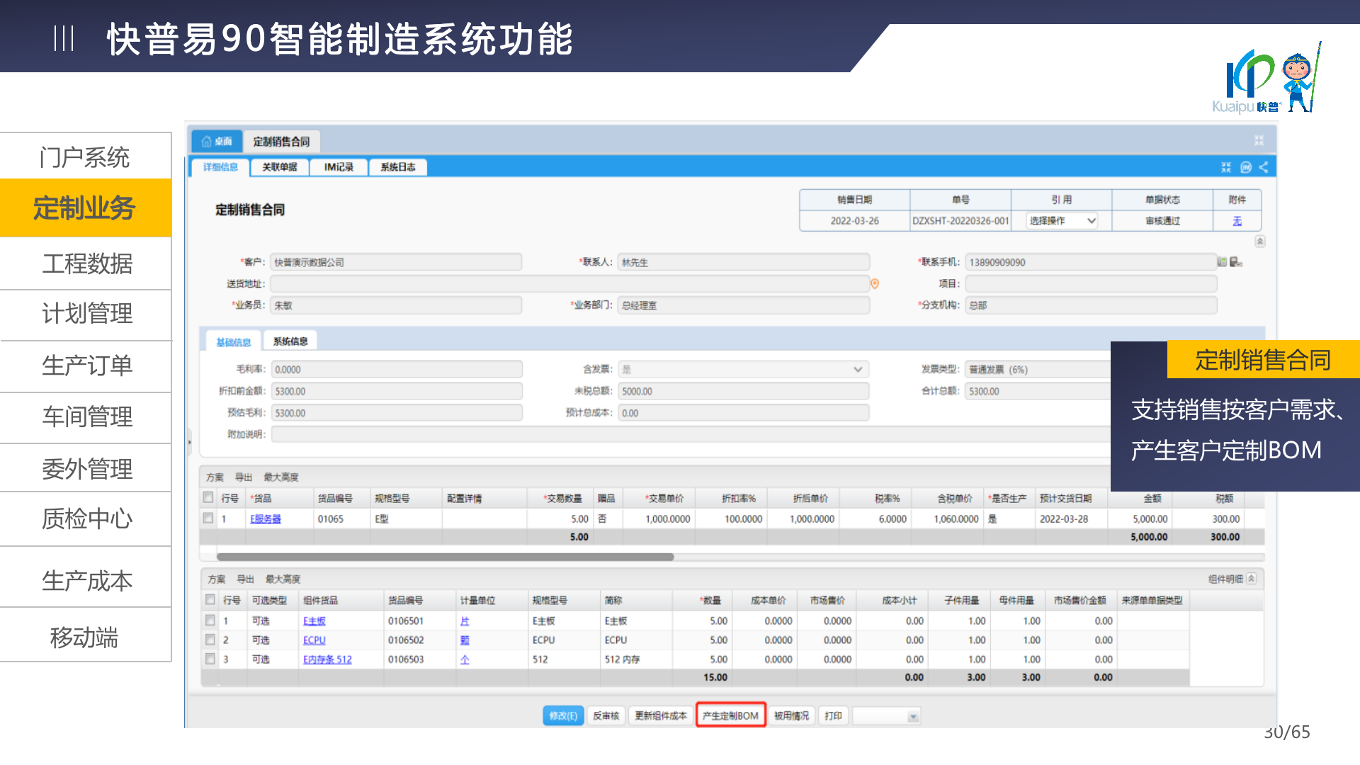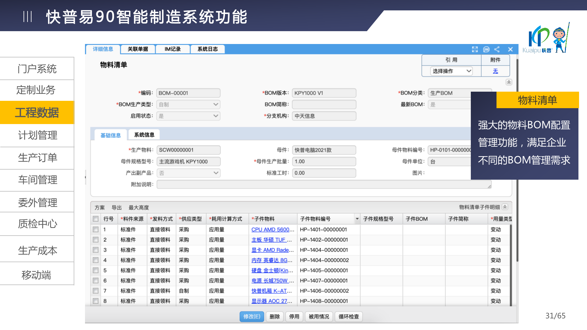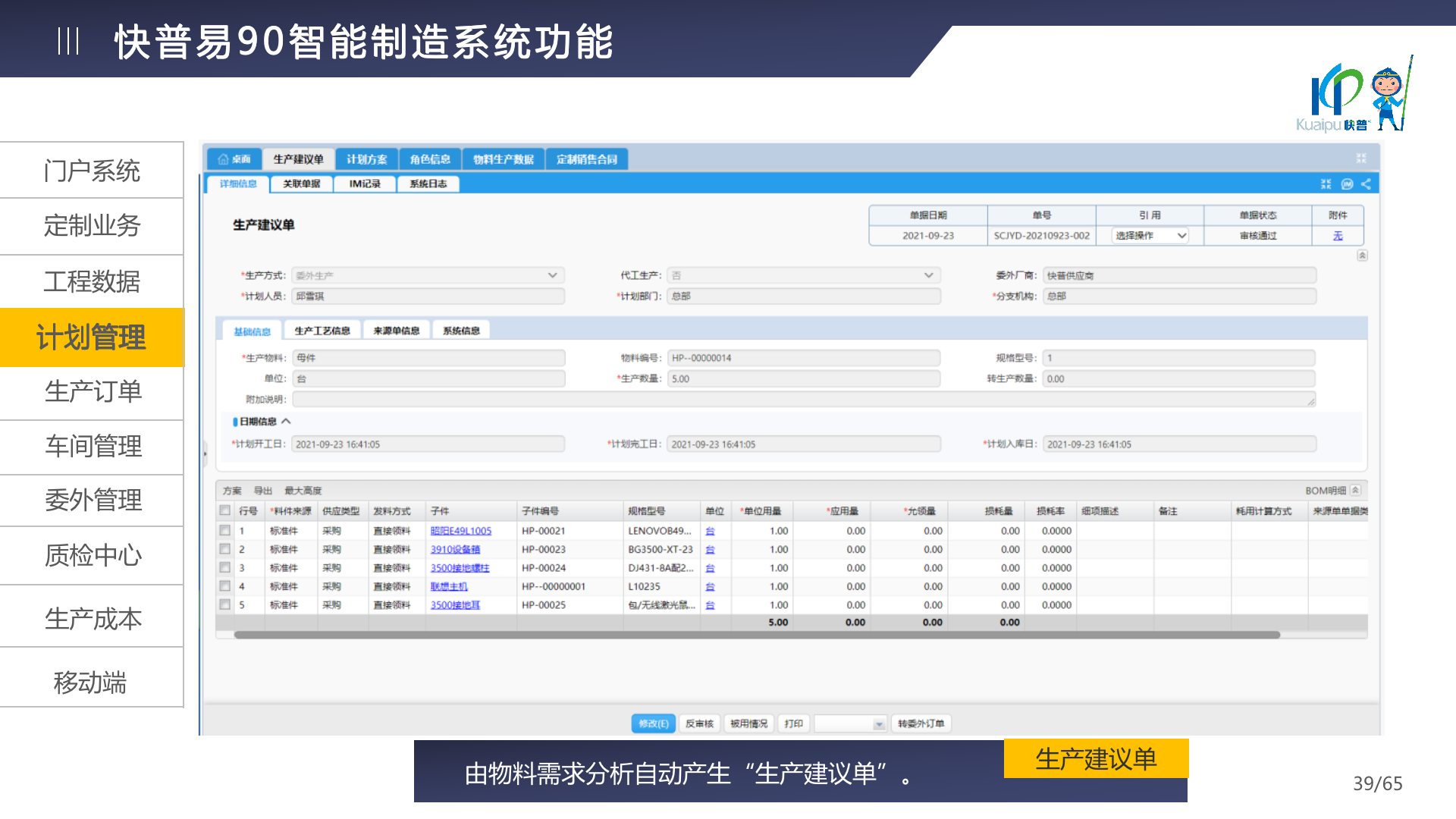 快普易90融合了大量精益生產管理的經驗,涵蓋計劃管理、BOM管理、MRP運算、生產訂單管理、供應鏈管理、車間管理、出入庫管理、委外管理、質量管理、生產成本核算、報表分析等全面生產管理,為企業(yè)打造實時感知變化、分析變化、提供決策的數(shù)字化管理平臺,推動企業(yè)創(chuàng)新的管理,實現(xiàn)“智能制造”的數(shù)字化轉型。