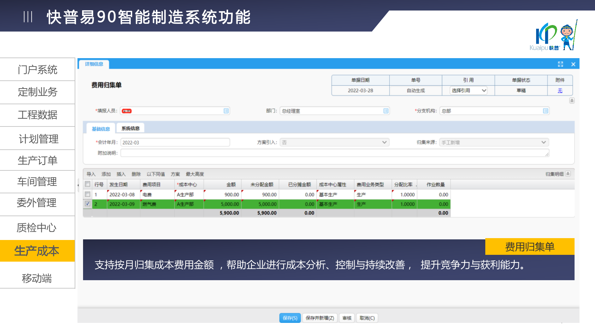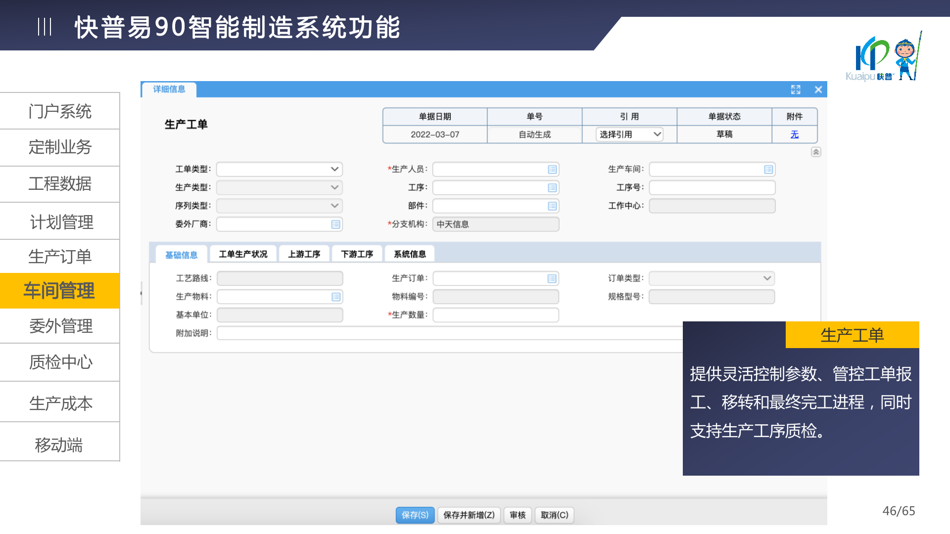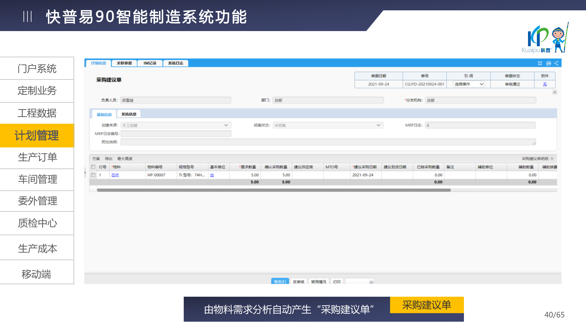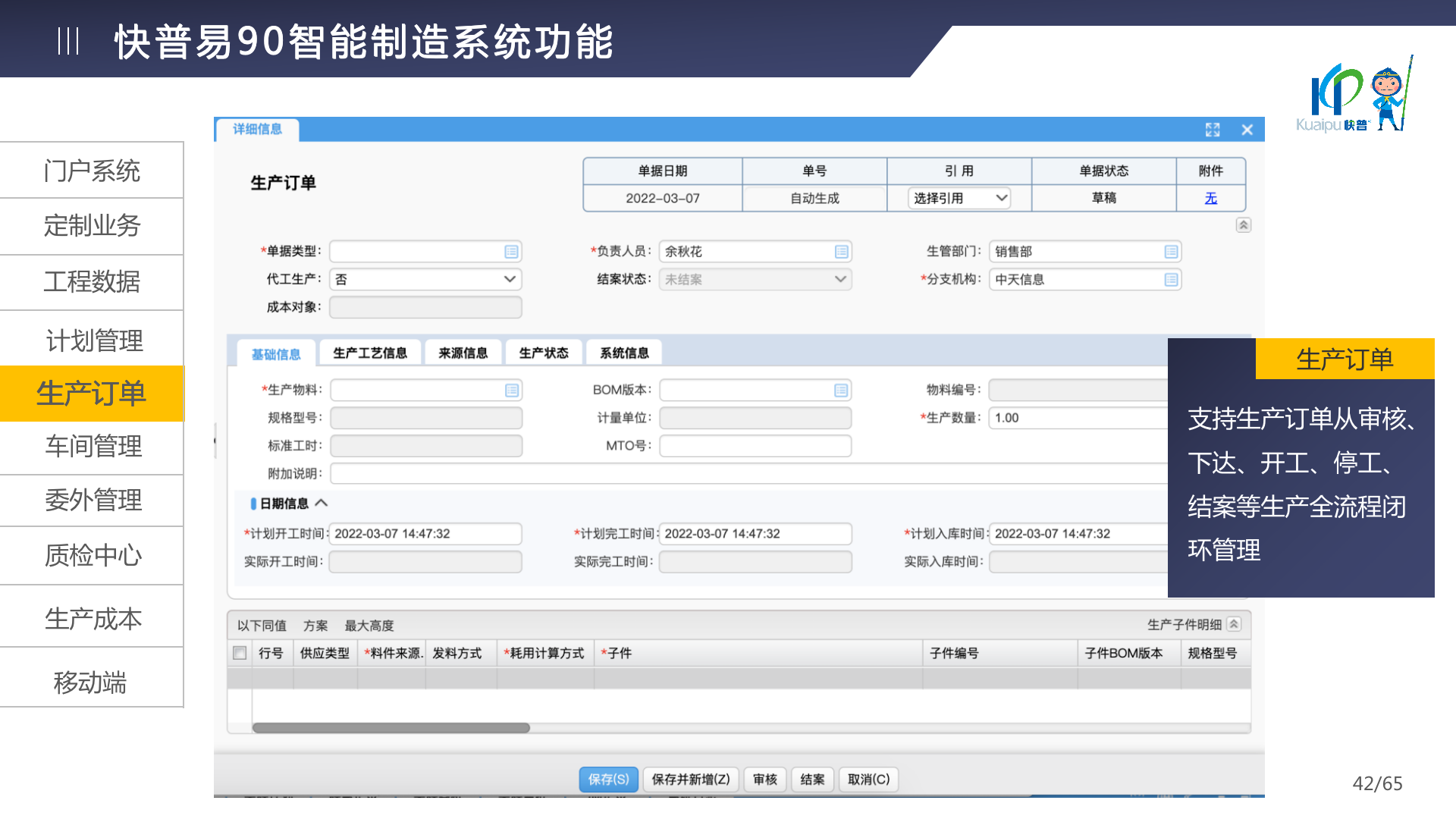 快普易90融合了大量精益生產管理的經驗,涵蓋計劃管理、BOM管理、MRP運算、生產訂單管理、供應鏈管理、車間管理、出入庫管理、委外管理、質量管理、生產成本核算、報表分析等全面生產管理,為企業(yè)打造實時感知變化、分析變化、提供決策的數(shù)字化管理平臺,推動企業(yè)創(chuàng)新的管理,實現(xiàn)“智能制造”的數(shù)字化轉型。