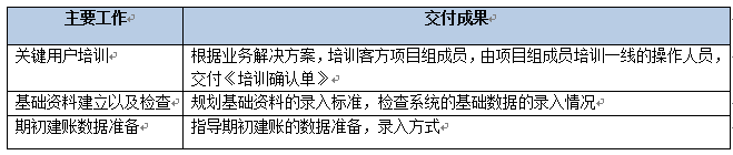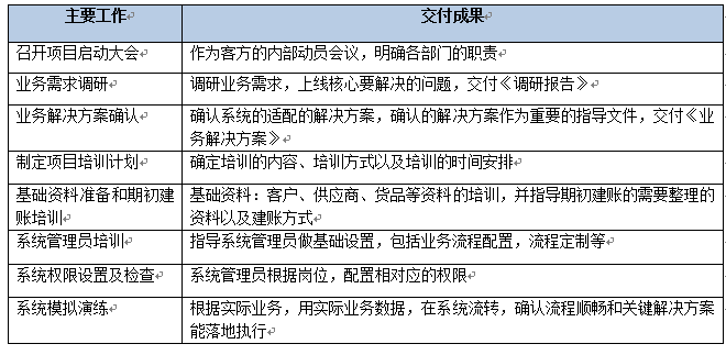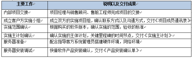 該階段主要是做實(shí)施基礎(chǔ)的搭建,包括完成內(nèi)部交接、確認(rèn)雙方的項(xiàng)目組成員名單、確認(rèn)實(shí)施范圍、確認(rèn)實(shí)施計(jì)劃、服務(wù)器準(zhǔn)備以及軟件部署。該階段結(jié)束以《項(xiàng)目啟動(dòng)階段里程碑確認(rèn)單》作為交付。