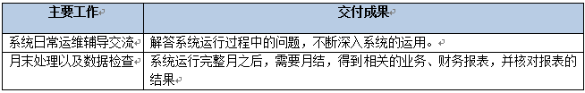 該階段主要是做系統(tǒng)開(kāi)賬運(yùn)作之后,持續(xù)支持運(yùn)用中出現(xiàn)的所有問(wèn)題,系統(tǒng)運(yùn)行完整月之后,指導(dǎo)月結(jié),得到相關(guān)的報(bào)表數(shù)據(jù)。該階段結(jié)束以《持續(xù)支持里程碑確認(rèn)單》作為交付。