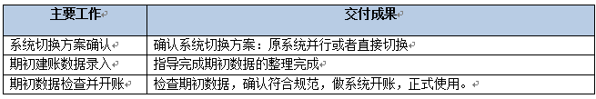 該階段主要是確認(rèn)系統(tǒng)的切換方案,檢查系統(tǒng)啟賬之前的所有準(zhǔn)備的數(shù)據(jù)的情況,確認(rèn)開(kāi)賬。該階段結(jié)束以《上線切換階段里程碑確認(rèn)單》作為交付。